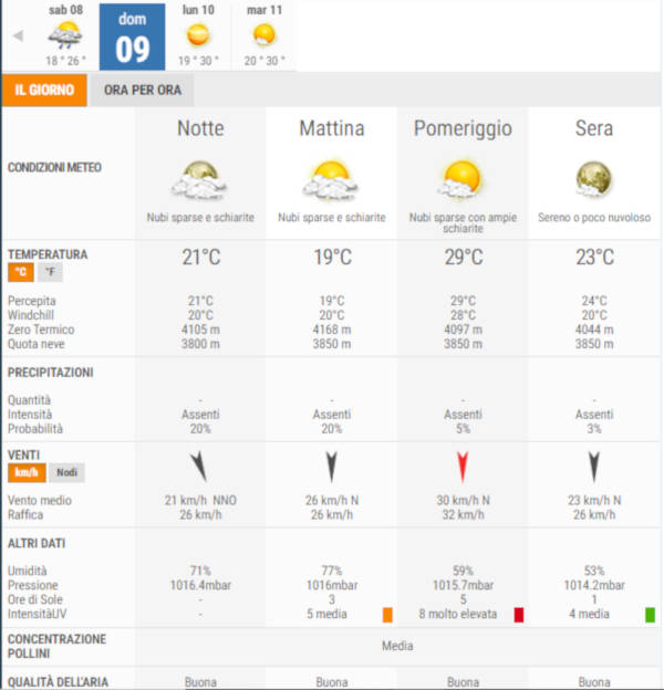 Secondo gli esperti di 3bmeteo, domani, Domenica 9 Agosto, avremo nubi sparse con ampie schiarite al mattino e nel pomeriggio, cielo sereno o poco nuvoloso la sera. Non sono previste piogge.