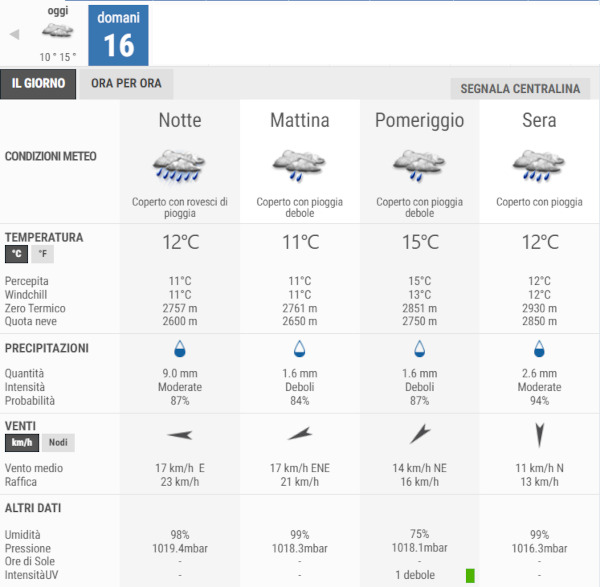 Invece, Giovedì 16 Ottobre avremo cieli molto nuvolosi o coperti con deboli piogge per l’intera giornata.