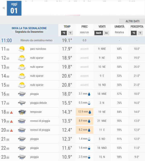 Secondo gli esperti di 3bmeteo oggi, Mercoledì 1 Ottobre avremo cieli in prevalenza poco nuvolosi al mattino, ma con rapido aumento della nuvolosità con piogge e rovesci anche temporaleschi dal pomeriggio.