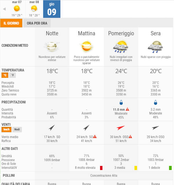 Giovedì 9 Giugno, invece, avremo cieli in prevalenza parzialmente nuvolosi, con rovesci anche a carattere temporalesco nel pomeriggio, in attenuazione dalla sera.