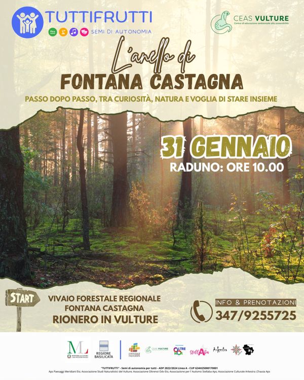 Il laboratorio “TuttiFrutti – Le impronte nel bosco” si inserisce all’interno del progetto TuttiFrutti – Semi di autonomia per tutti, un percorso di educazione, inclusione e partecipazione comunitaria che mette al centro le persone, le relazioni e il territorio del Vulture come spazio di crescita accessibile e condiviso.