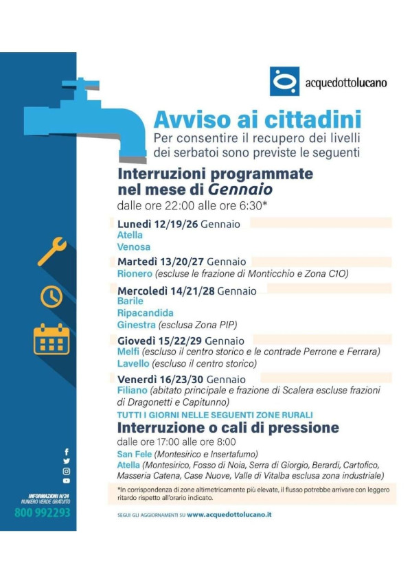 Acquedotto Lucano fa sapere che a Melfi, per un guasto improvviso, l’erogazione idrica sarà sospesa dalle 08:55 del 14/01/2026 fino alla fine dei lavori in:…