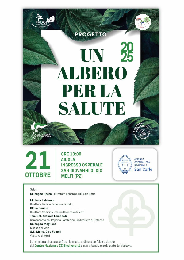 L’iniziativa nazionale, realizzata dalla Fadoi (Federazione delle Associazioni dei Dirigenti Ospedalieri Internisti) in collaborazione con i Carabinieri Raggruppamento Biodiversità, prevede anche quest’anno la donazione e la messa a dimora di giovani alberi negli ospedali italiani.