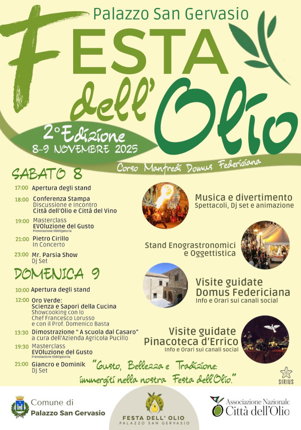 Il comune di Palazzo San Gervasio presenta il Programma per la 2 edizione della Festa dell’Olio 2025, un programma di imperdibili eventi che spaziano tra musica, cultura, storia, divertimento e spettacolo.