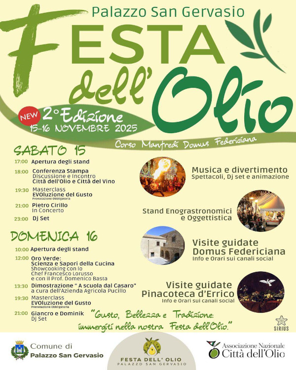 Il comune di Palazzo San Gervasio presenta il Programma per la 2 edizione della Festa dell’Olio 2025, un programma di imperdibili eventi che spaziano tra musica, cultura, storia, divertimento e spettacolo.