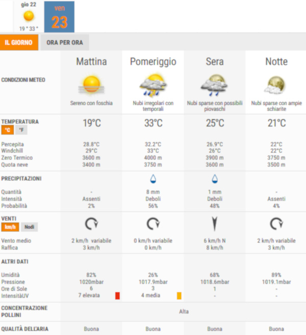 La temperatura massima registrata pare sarà di 33°C e la minima di 19°C.