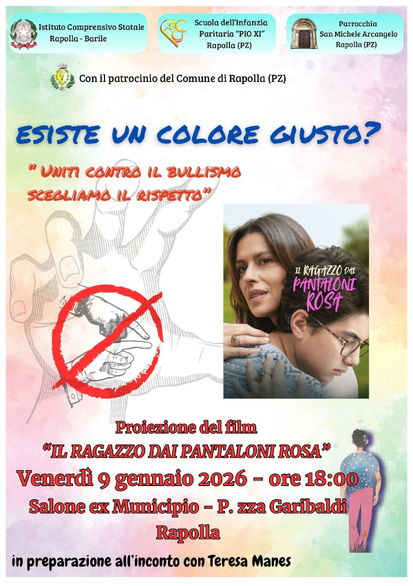 Domani 09 gennaio alle ore 18.00 in P.zza Garibaldi presso la ex sede municipale di Rapolla proiezione del film: “Il ragazzo dai pantaloni rosa”.