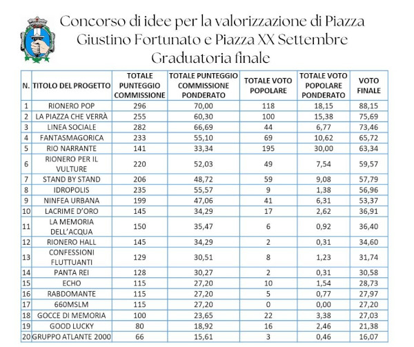 Tra le 20 idee progettuali, è risultata vincitrice “Rionero Pop”, 2° nella classifica popolare e 1° in quella generale elaborata sulla base del voto dei cittadini e del voto assegnato dalla commissione tecnica, come previsto dal bando.