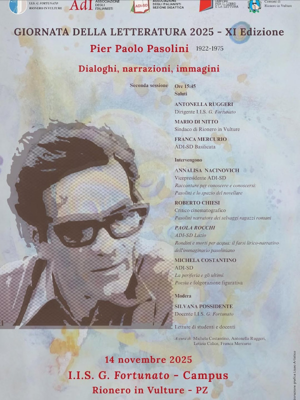 Il 14 Novembre 2025, alle ore 15:30, presso la sede del Campus dell’Istituto d’Istruzione superiore “G. Fortunato” di Rionero in Vulture, in occasione della undicesima “Giornata della letteratura” si terrà un convegno con esperti, docenti ed alunni delle classi quarte e quinte, sulla figura di Pier Paolo Pasolini.