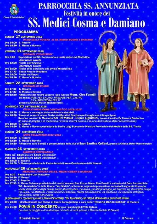 Oggi, Mercoledì 26 Settembre, Rionero celebra i Santi Medici Cosma e Damiano, martirizzati in Asia minore nel 303 d.C e ricordati per la loro disinteressata e gratuita opera di cura corporea e spirituale degli ammalati.