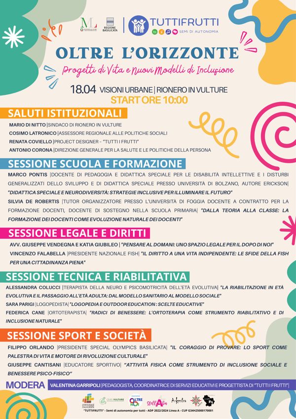 Ad aprire i lavori e presentare l’evento sarà Renata Coviello, Project Designer del progetto “Tutti i Frutti”, che illustrerà l’intenso lavoro di rete svolto in questi mesi dalle associazioni del territorio sui temi dell’inclusione e delle disabilità.