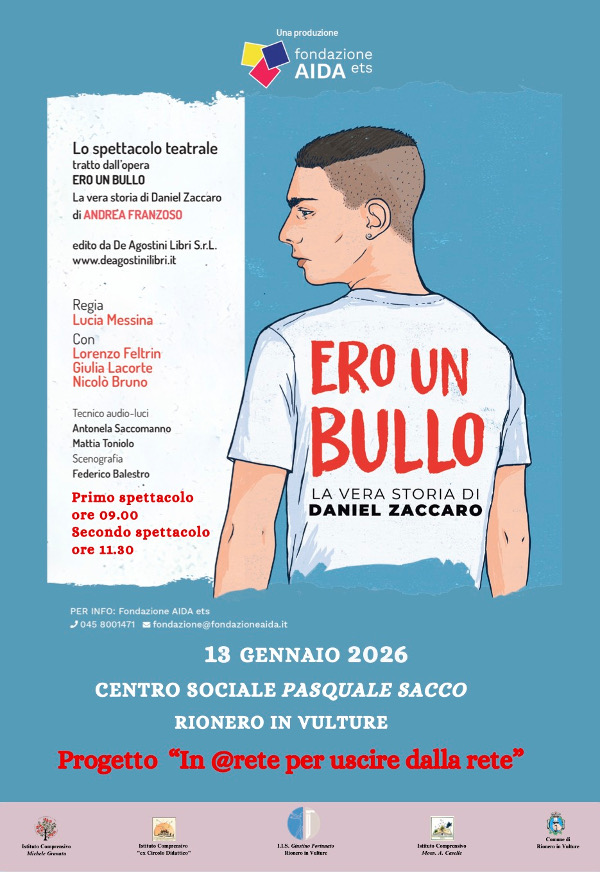 Il 13 Gennaio 2026, nell’ambito delle attività previste dal progetto “In@rete per uscire dalla rete”, gli studenti delle classi prime dell’IIS “G. Fortunato” di Rionero in Vulture assieme agli alunni delle classi terze dell’IC Ex Circolo didattico-Preziuso e dell’IC “Mons. Caselle” di Ripacandida e Barile, parteciperanno allo spettacolo teatrale “Ero un bullo” presso il centro sociale “P. Sacco”, rappresentazione tratta dall’omonimo romanzo di Andrea Franzoso.