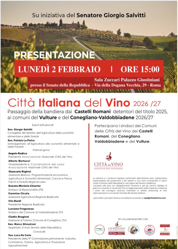 Lunedì 2 febbraio 2026 il Sindaco di Ripacandida rappresenterà il borgo in Senato (quale Comune capofila del raggruppamento dei comuni del Vulture alto Bradano), accompagnato da altri Sindaci del territorio, per la cerimonia ufficiale di consegna della bandiera di Città Del Vino 2026/2027 che sarà condivisa con i territori di Conegliano Veneto e Valdobbiadene.