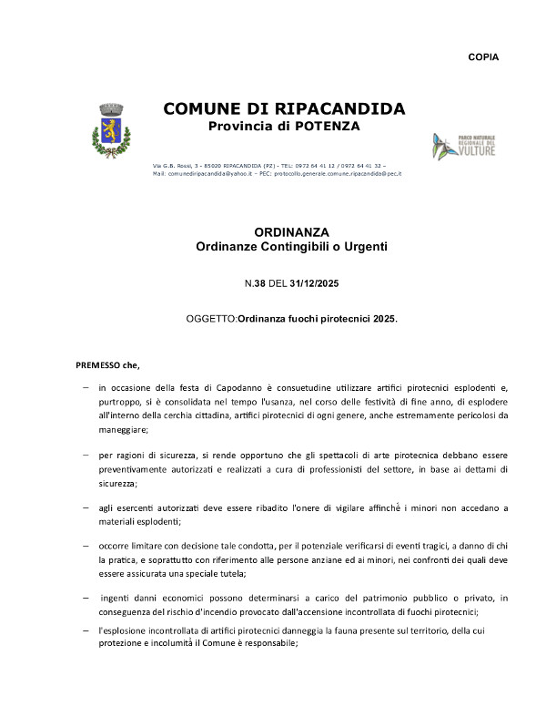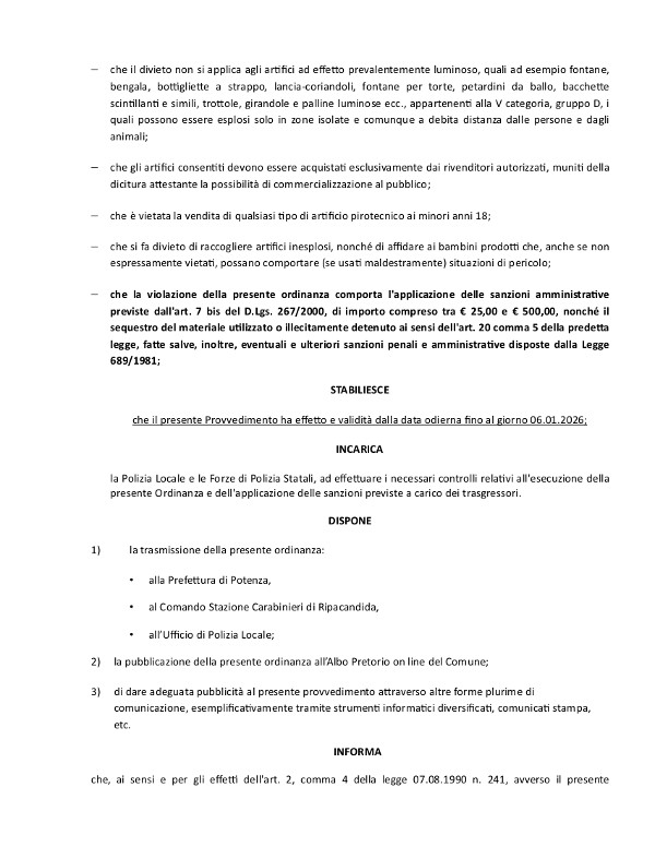 Divieto di utilizzo in tutto il territorio comunale di fuochi pirotecnici anche nel Comune di Ripacandida. Questa l’ordinanza completa.