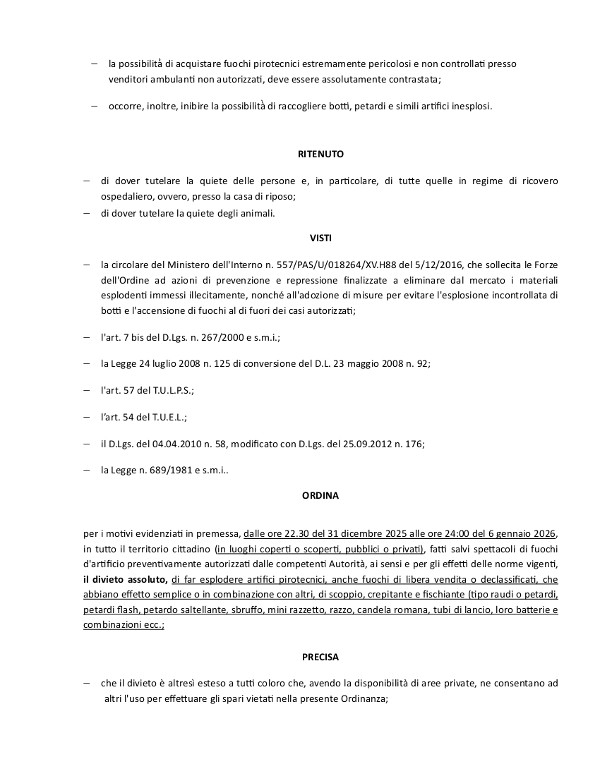 Dalle ore 00.00 del giorno 31 dicembre 2025 e sino alle ore 24.00 del giorno 2 gennaio 2026 è fatto divieto a chiunque di sparare,…