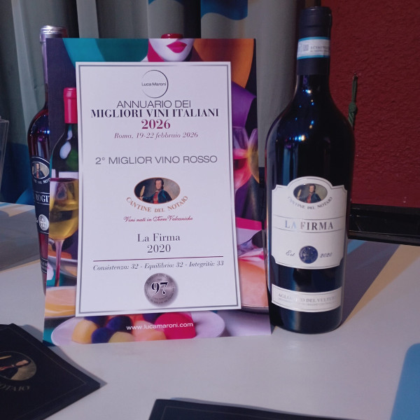 Nel corso della serata il vino Aglianico DOC la Firma 2020 di Cantine del Notaio è stato premiato come secondo miglior vino rosso nell’Annuario dei Migliori Vini Italiani 2026 su una valutazione complessiva di circa 8500 vini provenienti da tutte le regioni di Italia.