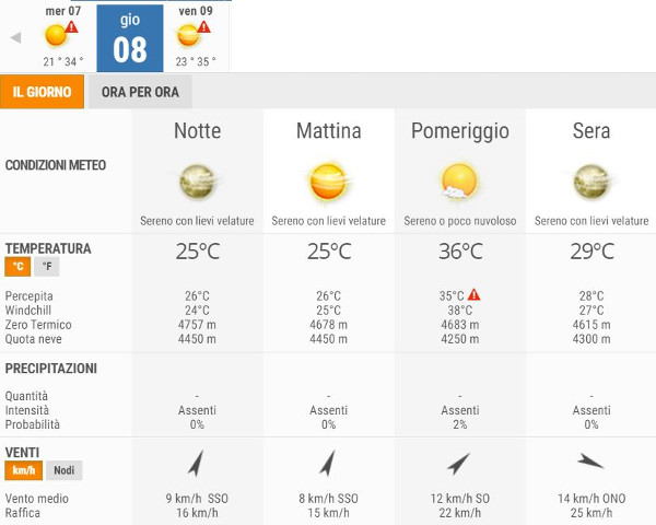 La temperatura massima registrata dovrebbe essere di 35°C, la minima di 25°C.