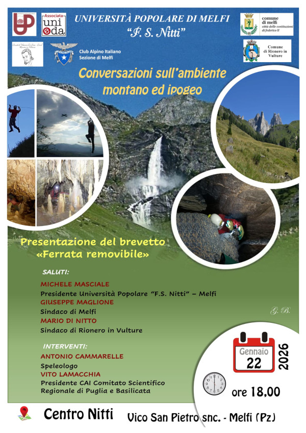 L’Università Popolare “F.S.Nitti” di Melfi promuove il convegno “Conversazioni sull’ambiente montano ed ipogeo”.