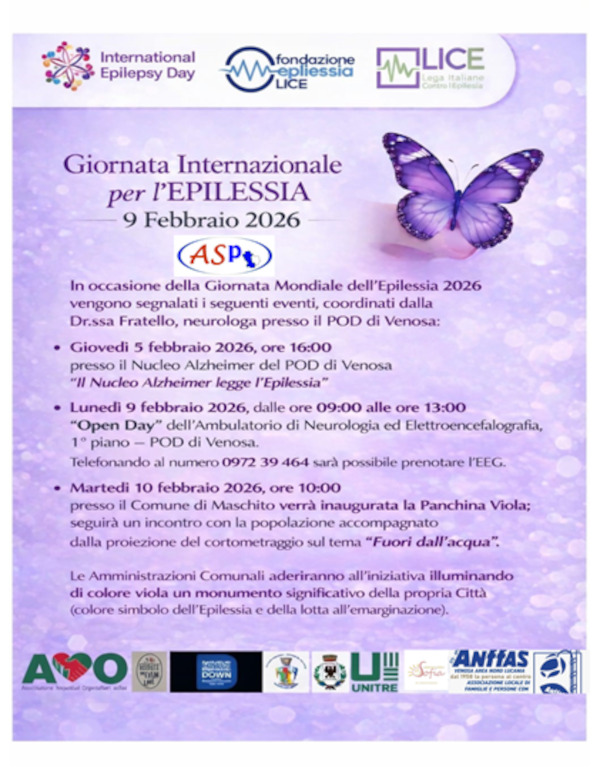 L’Azienda Sanitaria di Potenza il 5, 9 e 10 febbraio 2026 celebra la Giornata Internazionale dell’Epilessia con delle manifestazioni organizzate dall’Ambulatorio di Neurologia ed Elettroencefalografia afferente alla Unità Operativa CEIMI presso il Presidio Ospedaliero Distrettuale di Venosa.