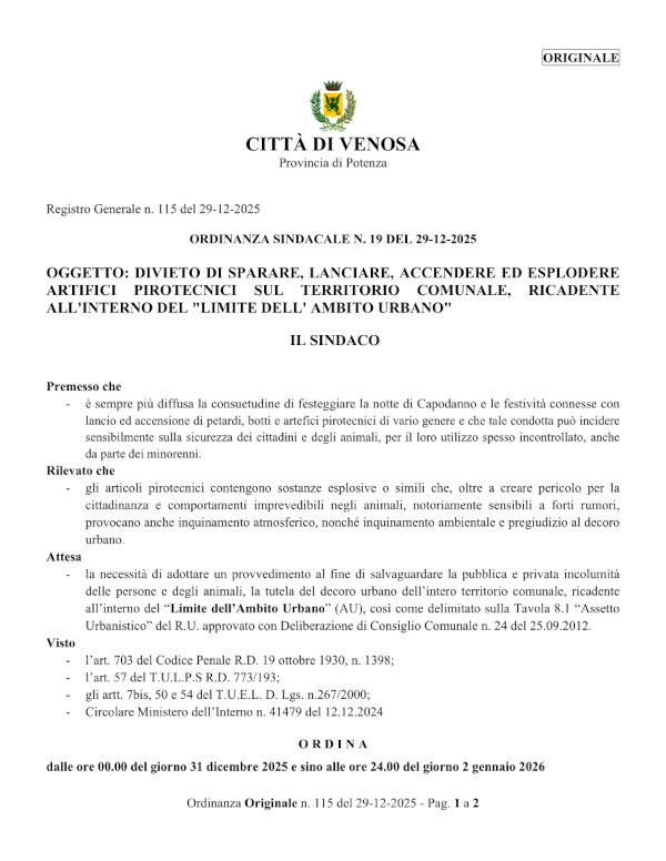 Dalle ore 00.00 del giorno 31 dicembre 2025 e sino alle ore 24.00 del giorno 2 gennaio 2026 è fatto divieto a chiunque di sparare, lanciare, accendere ed esplodere artifici pirotecnici e oggetti similari nell’intero territorio comunale, ricadente all’interno del “Limite dell’Ambito Urbano” (AU), così come delimitato sulla Tavola 8.1 “Assetto Urbanistico” del R.U. approvato con Deliberazione di Consiglio Comunale n. 24 del 25.09.2012, fatta eccezione per i materiali pirotecnici consentiti, che per loro natura e funzione, non siano concepiti per causare esplosione e rumori molesti e che siano limitati alla sola produzione di effetti luminosi.