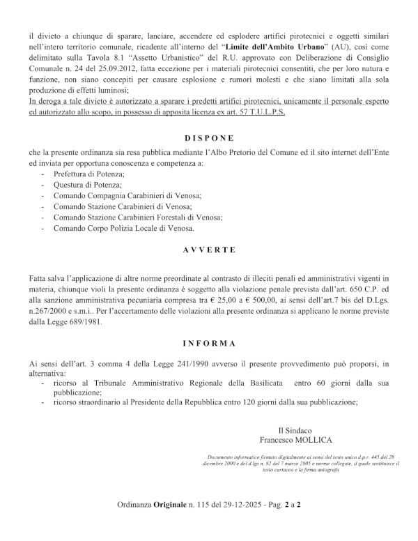Venosa, divieto di utilizzo di petardi e botti di Capodanno. Ecco l’Ordinanza