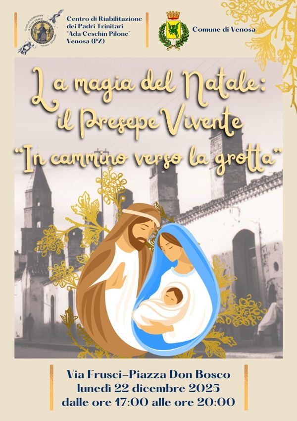Si intitola “Il cammino verso la grotta”, il Presepe Vivente promosso dai Padri Trinitari di Venosa, in programma Domenica 22 Dicembre, dalle ore 17:00 alle 20:00, nel cuore del centro storico della città d’Orazio.