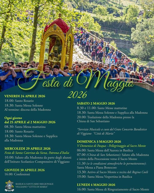 - la prima Domenica di Maggio una processione solenne porta la statua dalla Basilica Pontificia di Viggiano al santuario sul sacro Monte, posto a 12 km dal centro abitato ad una altitudine di 1725 metri;