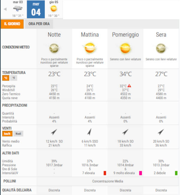 Giovedì 5 Agosto, invece, avremo cielo sereno con lievi velature il mattino, sereno o poco nuvoloso il pomeriggio, sereno la sera.