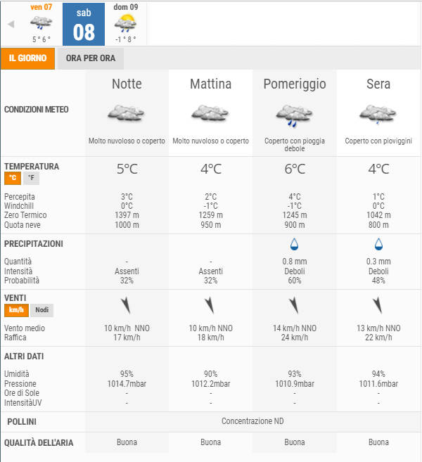 La temperatura massima registrata pare che sarà di 8°C, la minima di -1°C.